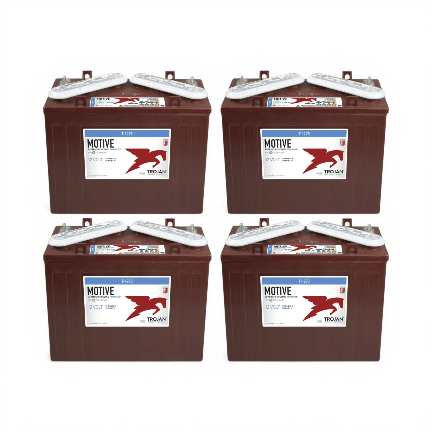 Lot de 4 batteries Trojan T1275 12V 150Ah à décharge profonde, idéales pour installations solaires, golfettes 48V et applications industrielles.